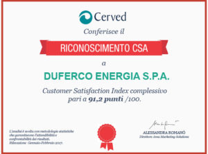 Duferco Energia SpA conferma anche quest’anno l’eccellente risultato sul livello di soddisfazione complessiva dei propri clienti luce e gas. L’analisi sviluppata da Cerved evidenzia un livello di soddisfazione della clientela di Duferco Energia oltre gli standard del mercato, dimostrando come l’attenzione nei confronti del cliente sia uno dei valori aggiunti che l’azienda è in grado di fornire al mercato energetico italiano.